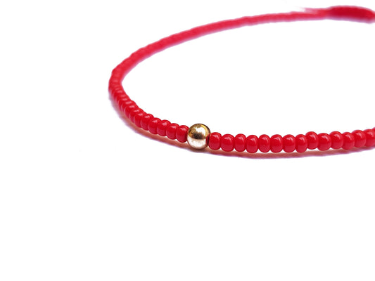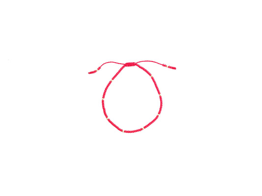 Pulsera roja tejida con puntos de oro