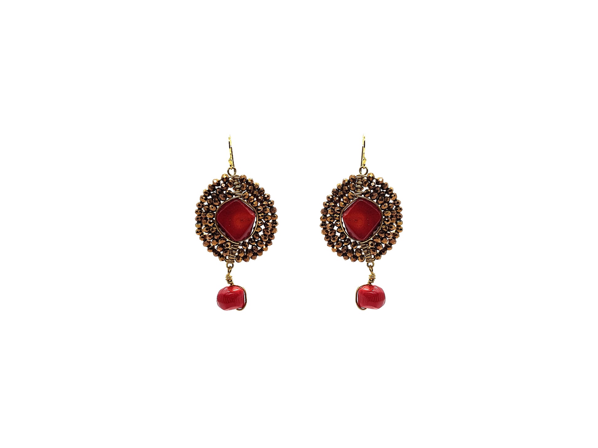 - Aretes de medallón piedra natural (coral), engastados en cristales facetados en color cobre.