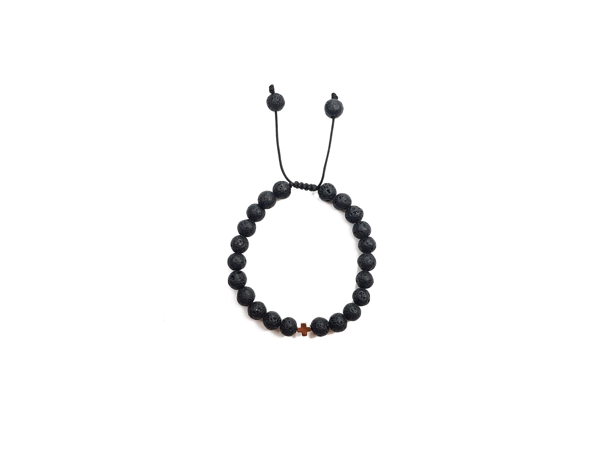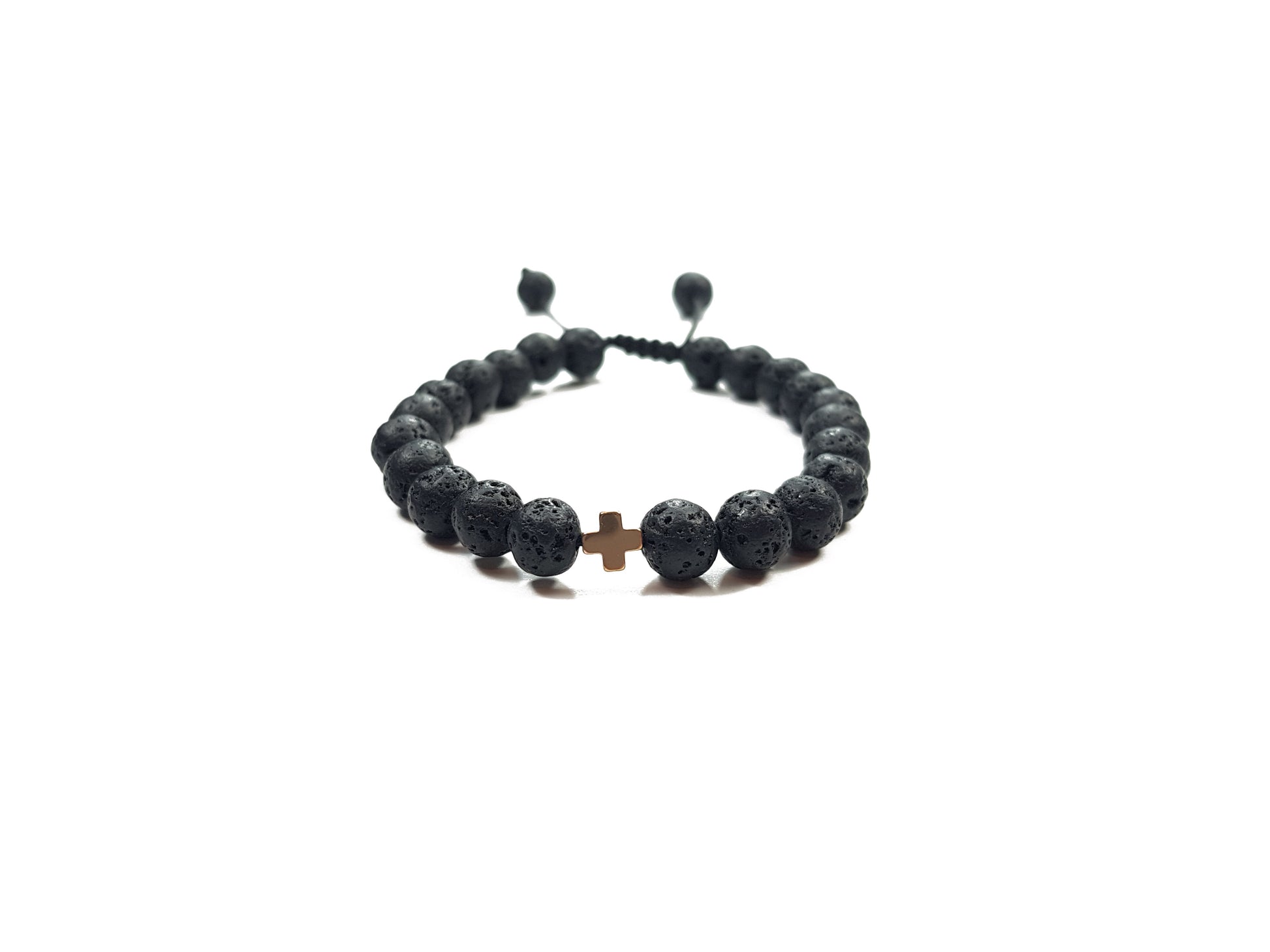 Las cuentas de piedra natural volcánica son conocidas por sus propiedades de fortaleza, transformación y conexión con la tierra, brindando estabilidad y absorbiendo las energías negativas. En el centro, la cruz de Hematita dorada actúa como un símbolo de protección y resistencia, fomentando la claridad mental y el equilibrio emocional.