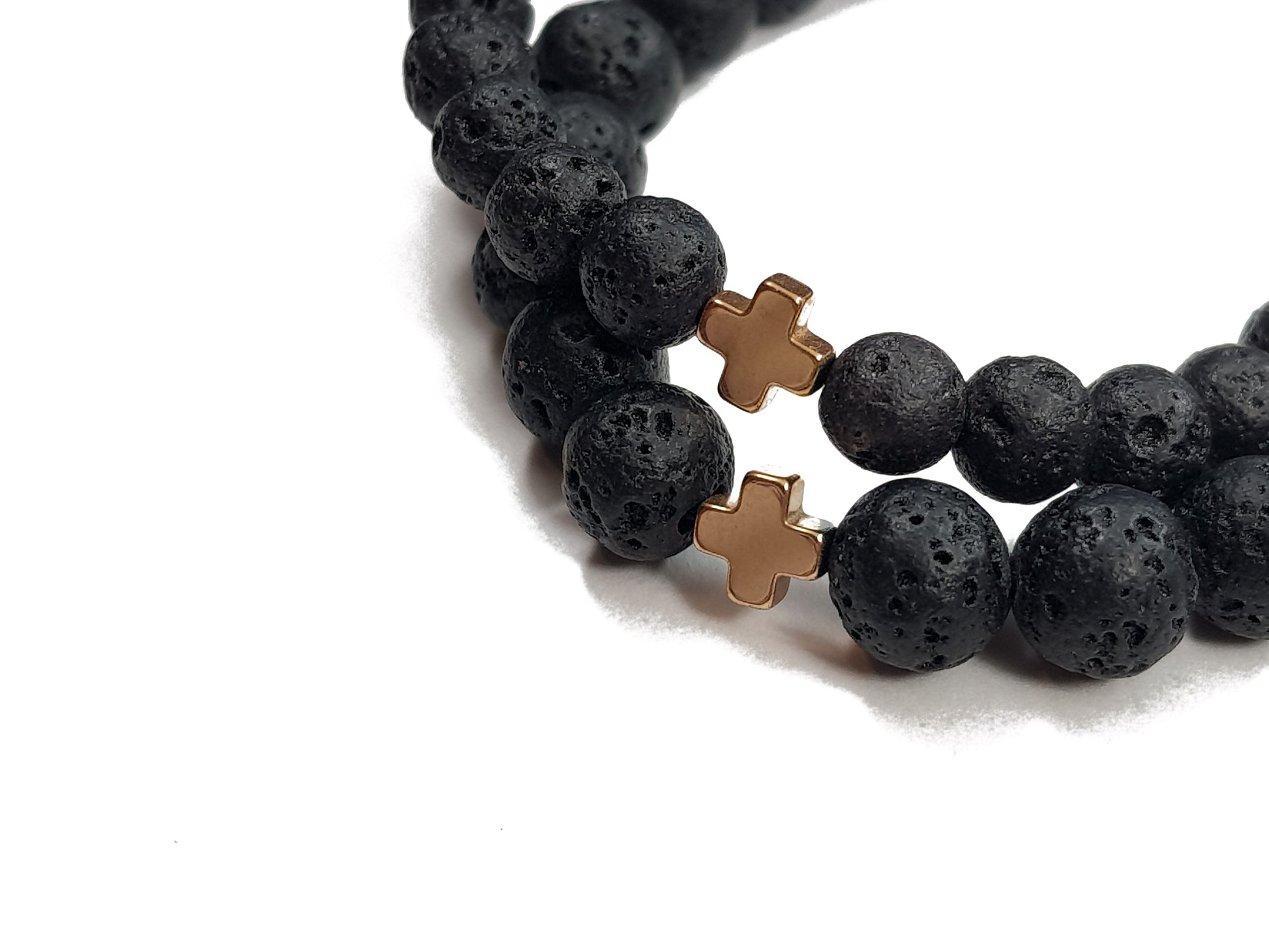 Juego de dos pulseras elaboradas a mano en textil negro, con cuentas de piedra natural volcánica y cruz de Hematita dorada.
